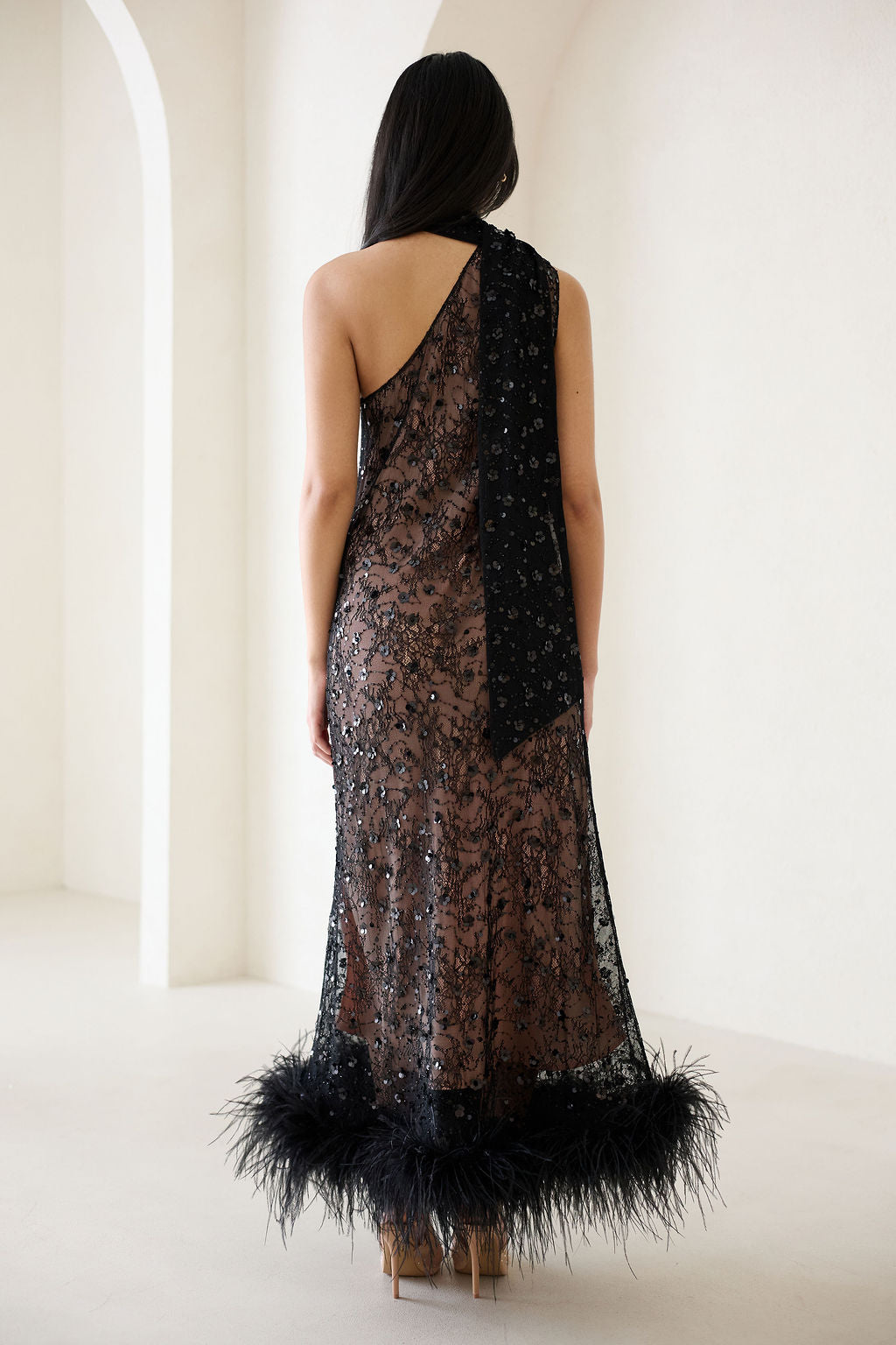 An elevated expression of evening elegance, this one-sleeve dress is crafted from intricately embellished black lace layered over a warm nude base, creating a striking interplay of texture and tone. The silhouette is cut on the bias, allowing the gown to glide effortlessly over the body with a soft, fluid drape.