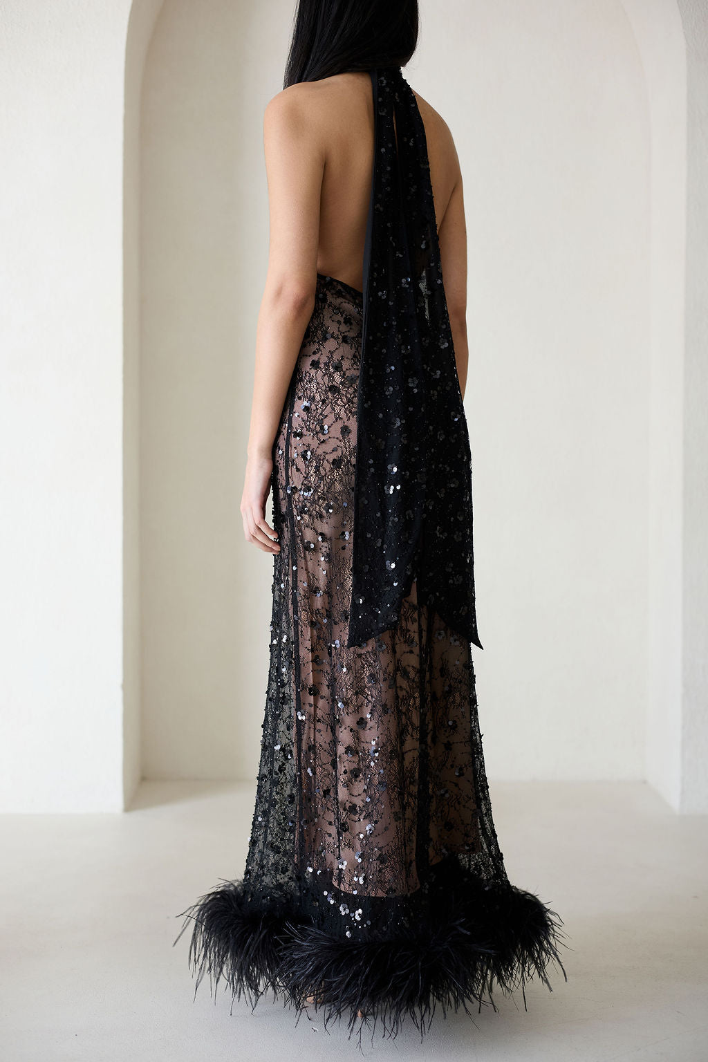 The high halter neckline frames the shoulders with understated sophistication, while the open sides introduce a subtle sense of sensuality. Tonal sequins are scattered throughout the lace, catching the light with a refined, understated shimmer.